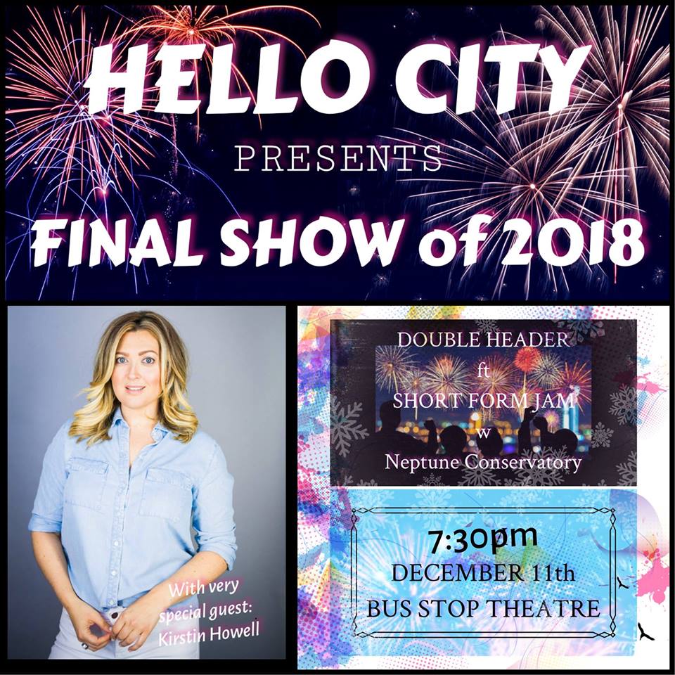 Let’s celebrate 2018 with a DOUBLE HEADER! We begin the night with a Hello City set: improv inspired by stories from our very special guest, Kirstin Howell. We follow up with a super fun short form improv jam ft. students from Neptune Theatre School’s Adult Improv Conservatory. What a way to end the year!