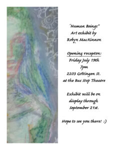 Join us on Friday, July 19 for an opening reception of Robyn MacKinnon’s Human Beings, the latest exhibit on the Bus Stop Theatre Gallery Wall, at 7:00pm.