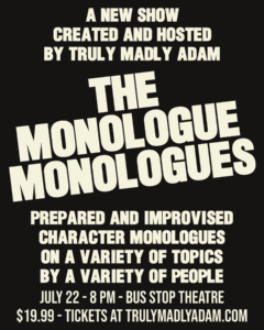 Join comedian and host Truly Madly Adam for The Monologue Monolugues! An evening of prepared and improvised character monologues by some of Halifax’s best comedians and improvisers! Come for the laughs, stay for the drama! Tickets available at trulymadlyadam.com